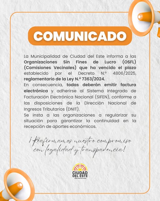 La Municipalidad de Ciudad del Este informó que, según el Decreto N.º 4806/2025, todas las organizaciones sin fines de lucro, incluidas las comisiones vecinales, deberán adherirse al Sistema Integrado de Facturación Electrónica Nacional (SIFEN).